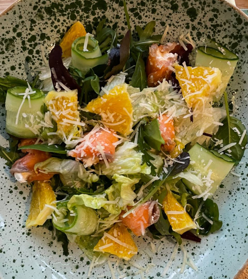 Мікс салату, лосось, огірок, пармезан, крем-сир, цитрусова заправка